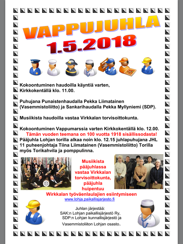 Kokoontuminen haudoilla käyntiä varten, Kirkkokentällä klo. 11.00. Puhujana Punaistenhaudalla Pekka Liimatainen (Vasemmistoliitto) ja Sankarihaudalla Pekka Myllyniemi (SDP). Musiikista haudoilla vastaa Virkkalan torvisoittokunta. Kokoontuminen Vappumarssia varten Kirkkokentällä klo. 12.00. Tämän vuoden teemana on 100 vuotta 1918 sisällissodasta! Pääjuhla Lohjan torilla alkaa noin klo. 12.15 juhlapuhujana JHL 11 puheenjohtaja Tiina Liimatainen (Vasemmistoliitto) Torilla myös Torikahvila ja pomppulinna.