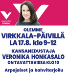 Olemme Virkkala-päivillä la 17.8. Klo. 9-12 kansanedustaja Veronika Honkasalon on tavattavissa klo. 10. Arpajaiset ja kahvitarjoilu
