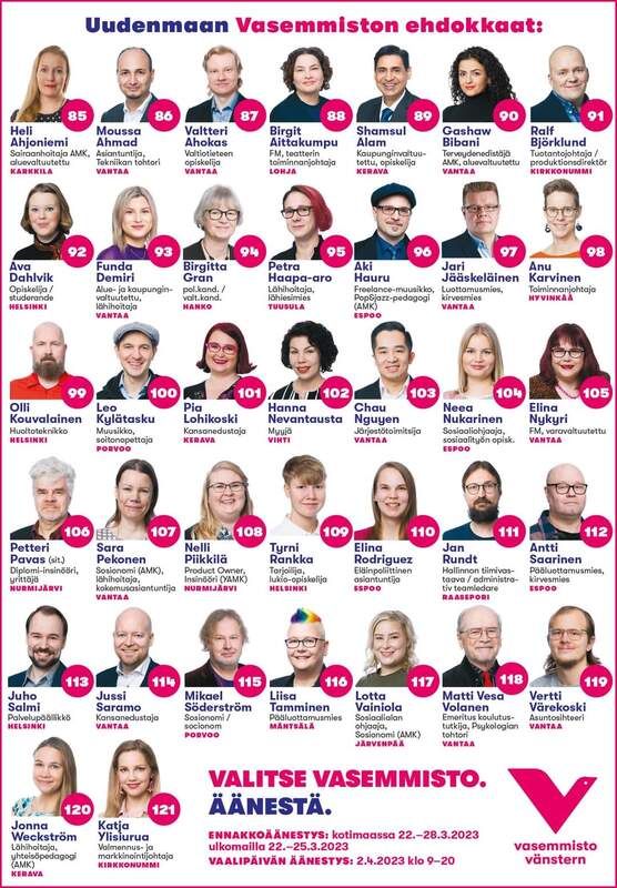 Äänestä reilumpi huominen kaikille, ei harvoille! Voit äänestää eduskuntavaaleissa ennakkoon 22.–28.3.2023 tai vaalipäivänä 2.4.2023 Vasemmistoliiton ehdokkaita Uudenmaan vaalipiirissä numeroilla 85–121. Tutustu ehdokkaisiimme ja tavoitteisiimme: https://uusimaa.vasemmisto.fi/eduskuntavaalit