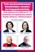 Tule keskustelemaan Karjalohjan seudun terveyspalveluista Avoin tilaisuus 22.3.2025 klo 10 - 13 Karjalohjan terveyskeskuksen pihalla. Tarjolla makkaraa, vihiksiä ja kahvia. Koollekutsujina: Birgit Aittakumpu, Aino Akinyemi, Matti Pajuoja ja Harry Yltävä