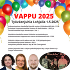 Työväen vappujuhla Lohjalla 1.5.2025 Kokoontuminen haudoilla käyntiä varten, Kirkkokentällä klo. 11.20. Puhujana Punaistenhaudalla Suzanne Di Rodi-Maukka ja Sankarihaudalla Birgit Aittakupu (Vas.) Musiikista haudoilla vastaa Virkkalan torvisoittokunta. Kokoontuminen Vappumarssia varten Kirkkokentällä klo. 12.00. Pääjuhla Lohjan torilla alkaa noin klo. 12.30 juhlapuhujana kansanedustaja Joona Räsänen. Pääjuhlan päättää Rockin' Roy & The Coverganes! Juhlan järjestää: SAK:n Lohjan paikallisjärjestö Ry, Lohjan Demarit ja Lohjan Vasemmisto. |