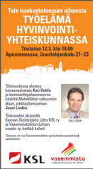 Tiistaina 12.3. klo 18.00 Apuomenassa, Suurlohjankatu 21–23 Tilaisuudessa alustaa kansanedustaja Kari Uotila ja kommenttipuheenvuoron käyttää Metalliliiton valtuuston jäsen, pääluottamusmies Jouni Linden Tilaisuuden järjestää Kansan Sivistystyön Liitto KSL ry ja Vasemmistoliiton Lohjan osasto ry. keittää kahvit Tilaisuus on osa Vasemmistoliiton puoluekokousasiakirjan valmistelua. Liitteet