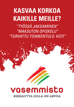 Ennen seuraavia vaaleja onkin luotava selkeä vasemmistolainen vaihtoehto. Tuloerojen kasvuun puuttuminen ja suomalaisen työn puolustaminen ovat ekologisten seikkojen ja yhteiskunnallisen oikeudenmukaisuuden lisäksi asioita, joiden puolesta on tehtävä töitä. Näin äänestäjät löytävät selkeän vasemmistolaisen vaihtoehdon heille tärkeiden asioiden edistämiseksi.